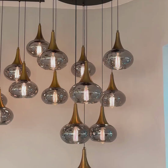 Stagger drop lengths for an artistic staircase pendant lighting effect.