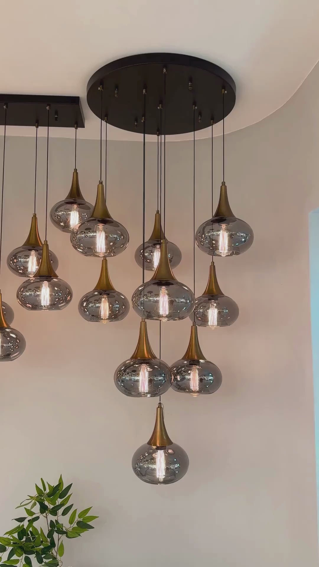 Each amber pendant light features a softly tinted glass globe, suspended from an adjustable cord for a floating, ethereal effect. The 9 lamp shade configuration creates dramatic ambiance, while the glow of vintage-style bulbs adds a cozy, luxurious feel—ideal for mid-century interiors and contemporary homes alike.
