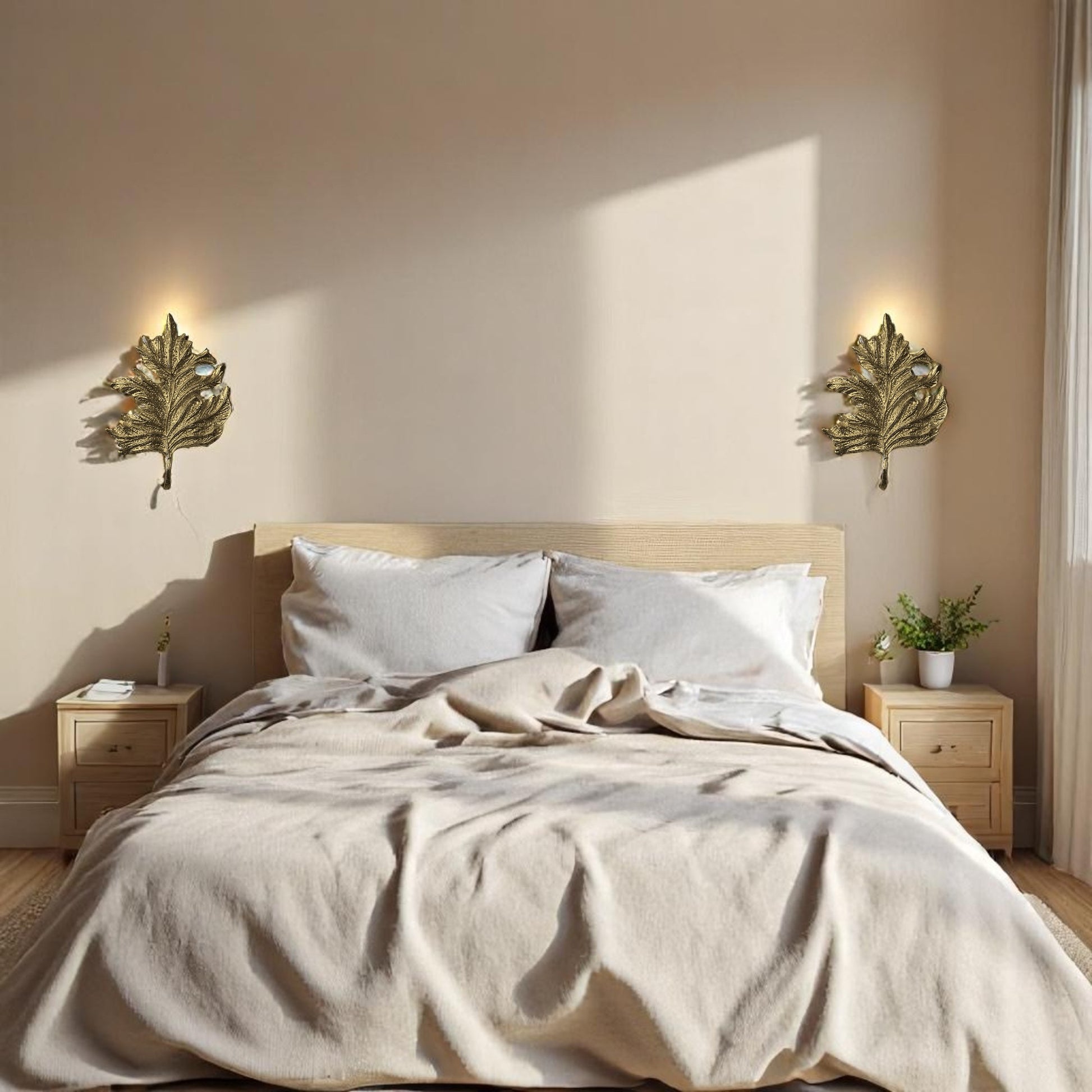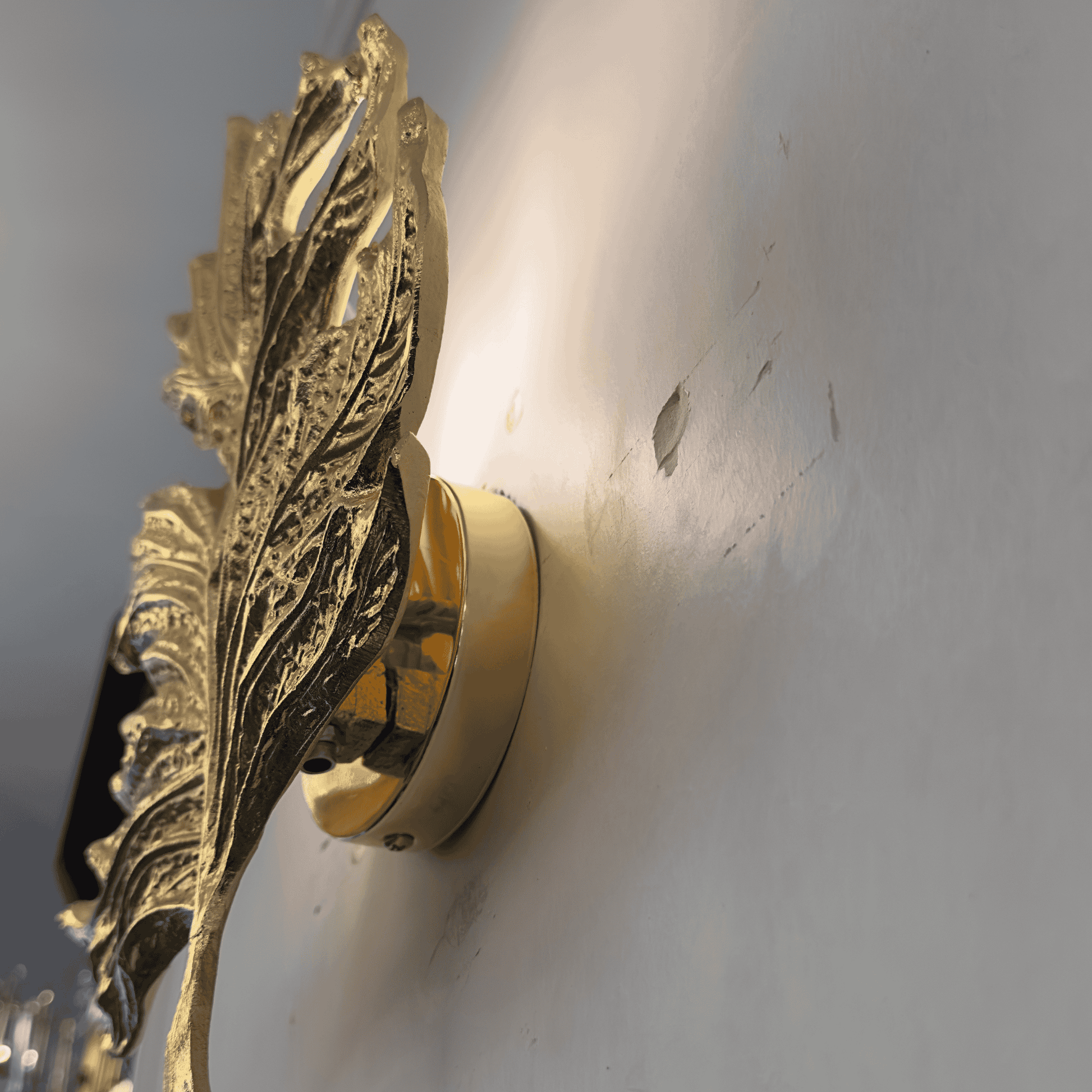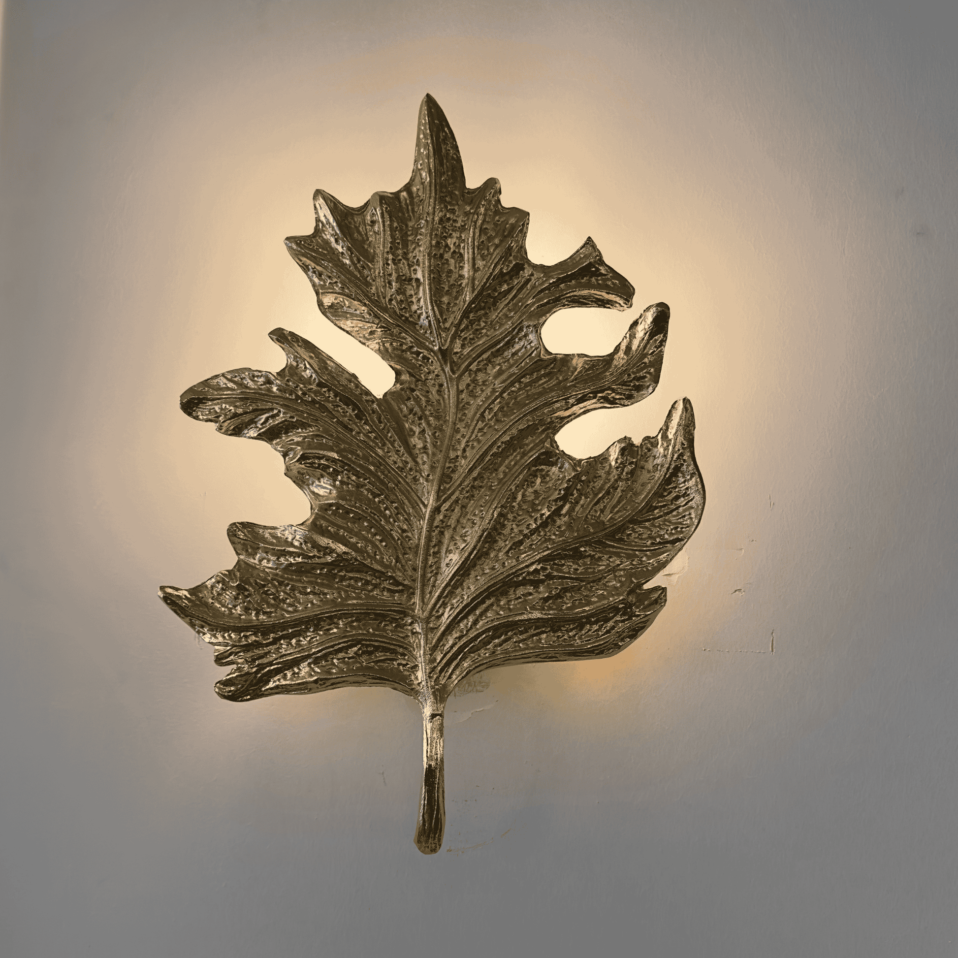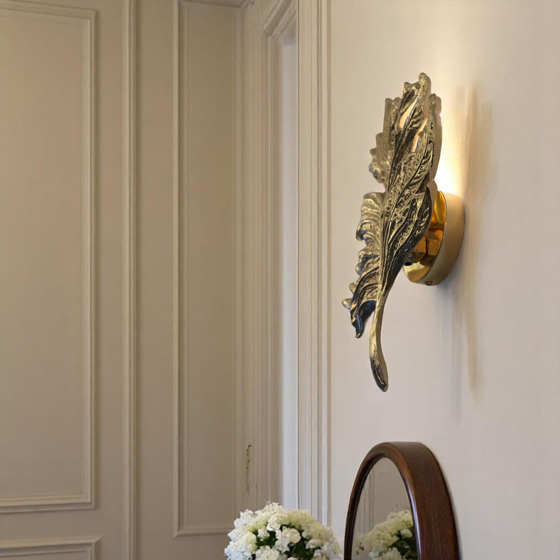 Bring a touch of nature-inspired elegance to your home with this handcrafted gold leaf wall sconce. Designed to mimic the intricate texture of a real leaf, this luxurious lighting piece blends organic form with artistic craftsmanship. Whether you're illuminating a hallway, creating a statement in a powder room, or adding warm light beside your bed, this sconce is a standout accent.