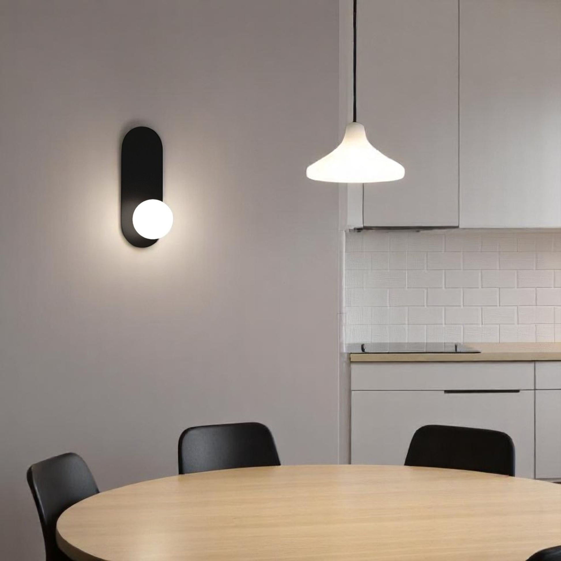 A sculptural wall sconce with matte black elegance and a soft glowing opal globe—crafted for designers of serene, modern spaces.