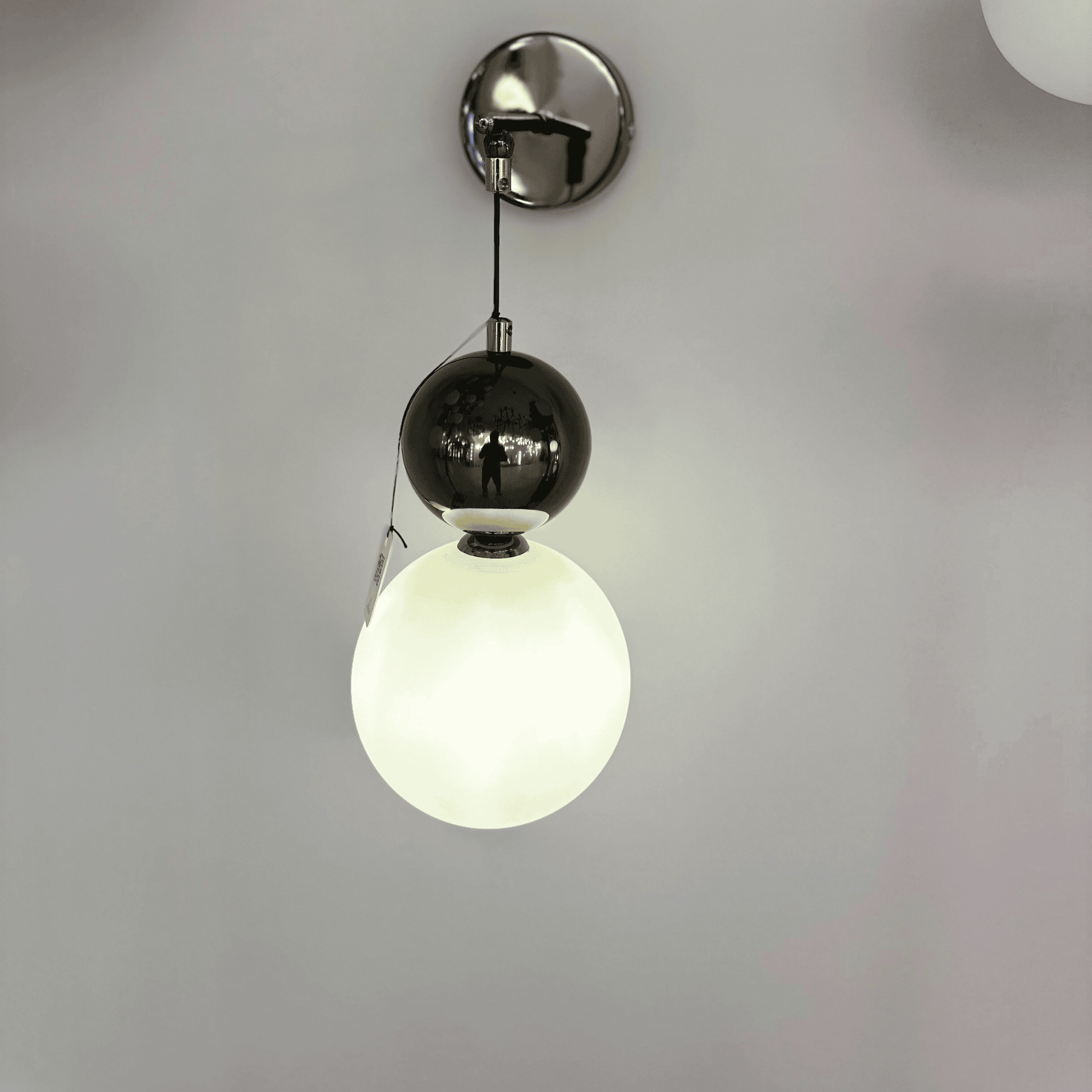 Add a bold yet elegant glow to your interior with this modern chrome and opal glass wall sconce. Featuring a high-shine metallic sphere suspended above a soft frosted globe, this fixture blends artistic form with functional lighting.