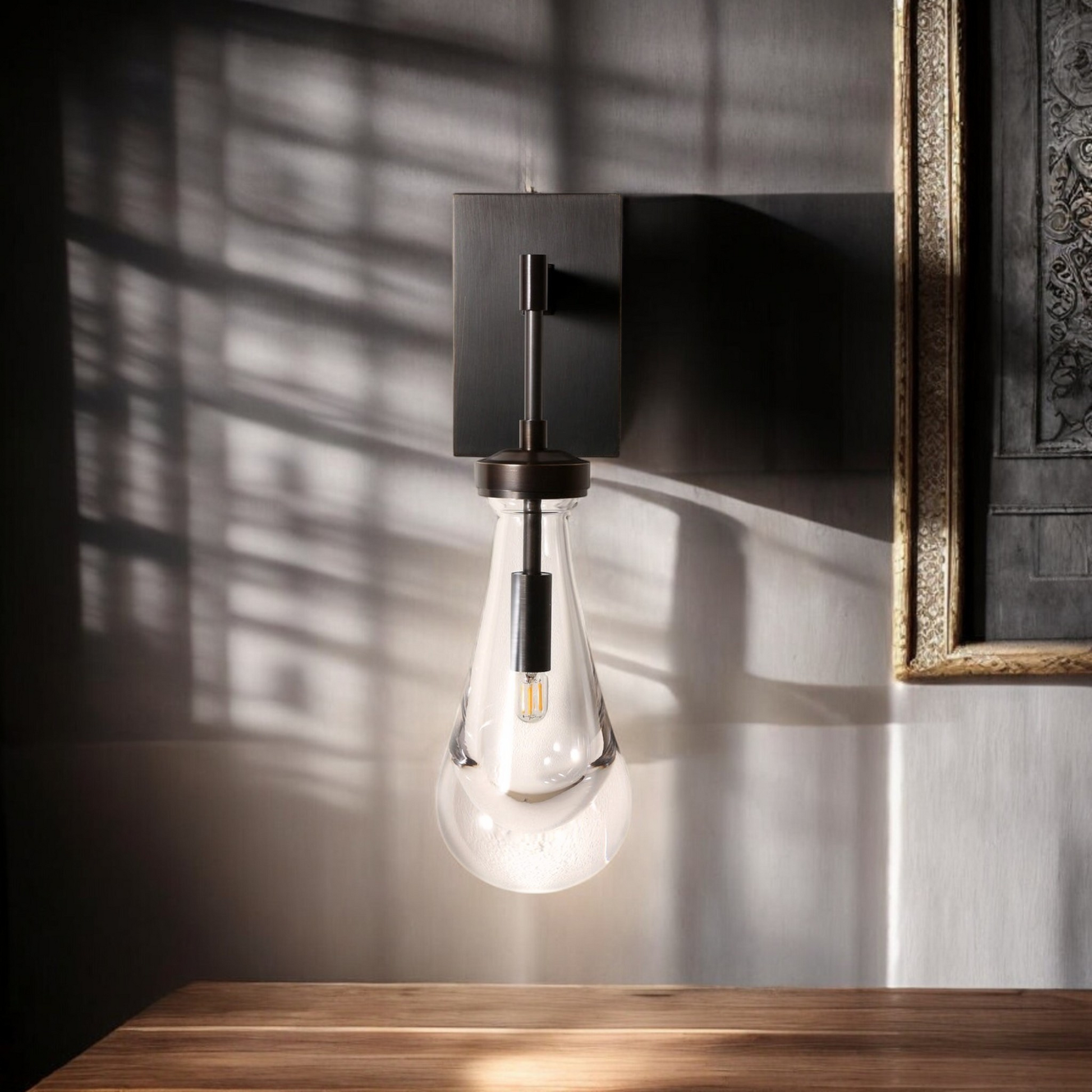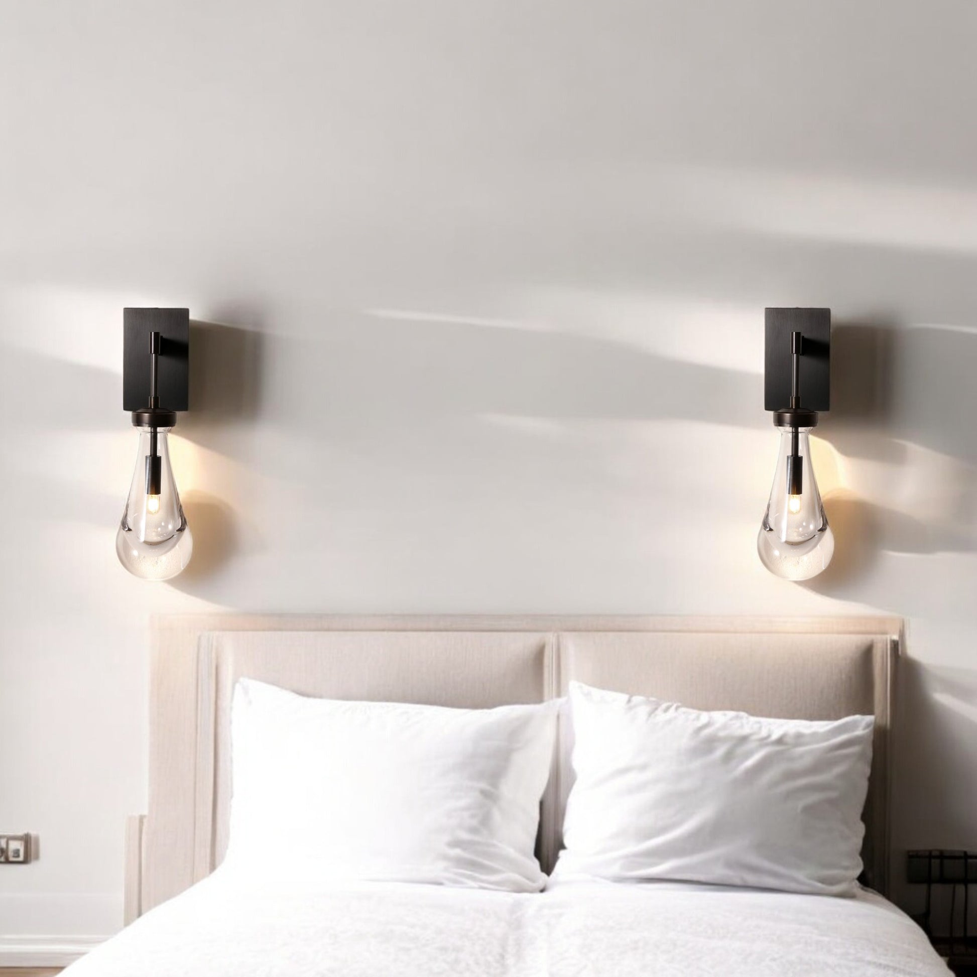 Bring refined elegance and ambient warmth to your interiors with our Modern Teardrop Glass Wall Sconce. Designed for discerning decorators and interior designers, this sculptural fixture pairs hand-blown clear glass with a sleek bronze-coated mount for an artful, contemporary statement. The tear-shaped silhouette diffuses light beautifully, creating a soft, inviting glow ideal for bedrooms, hallways, bathrooms, and boutique hospitality settings.