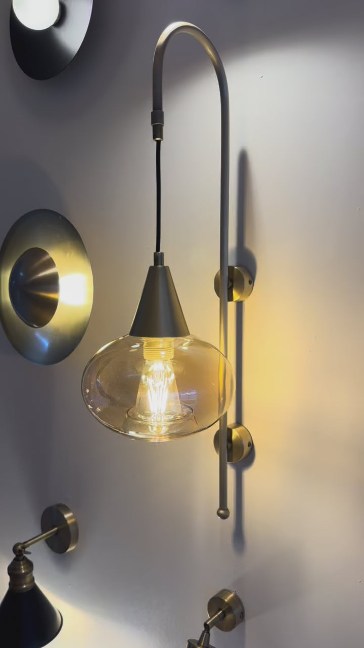 Elevate your space with this modern curved arm wall sconce—where sculptural form meets warm ambiance. Featuring a sleek metal frame and hand-blown glass shade, it casts a soft, inviting glow perfect for bedrooms, living rooms, hallways, or boutique interiors.