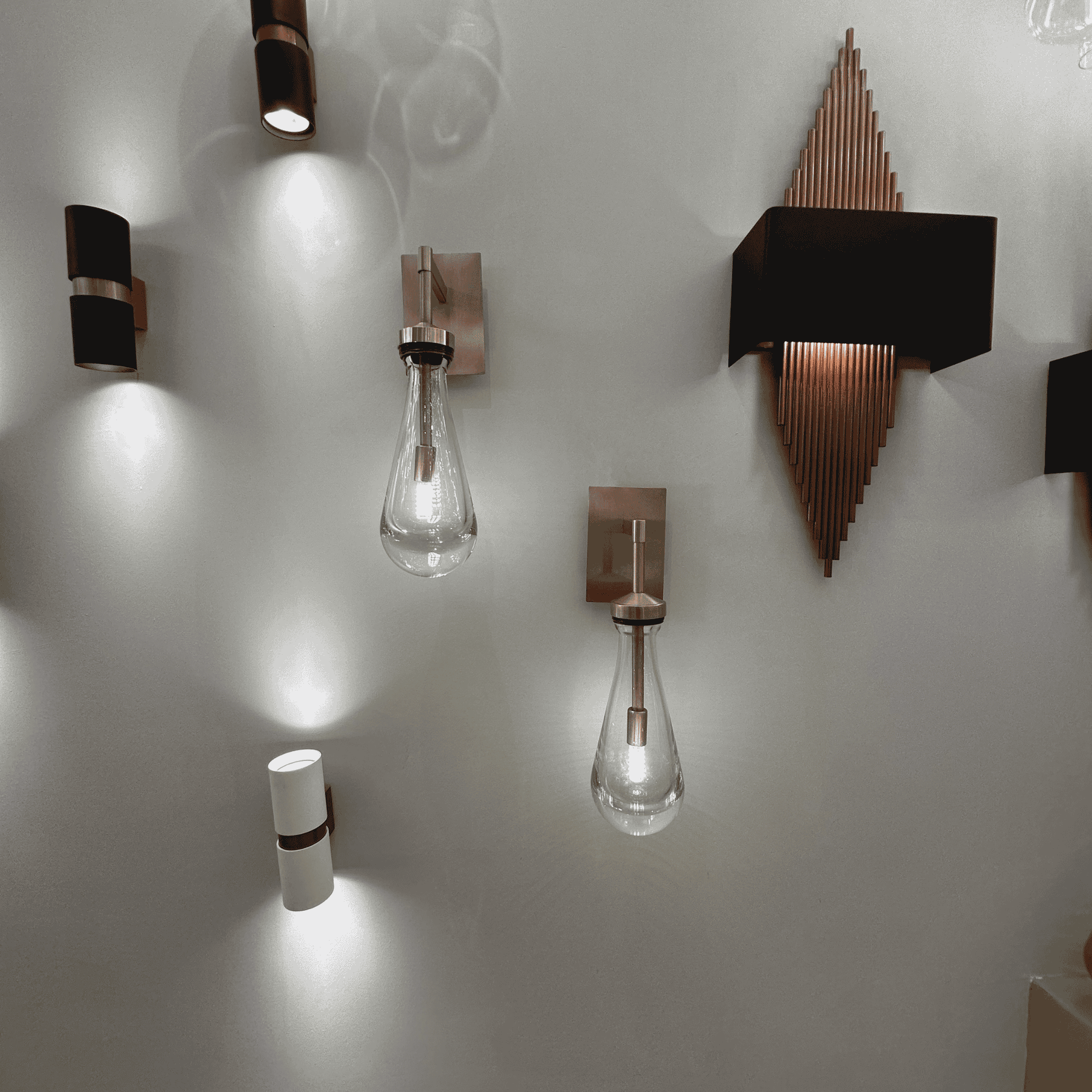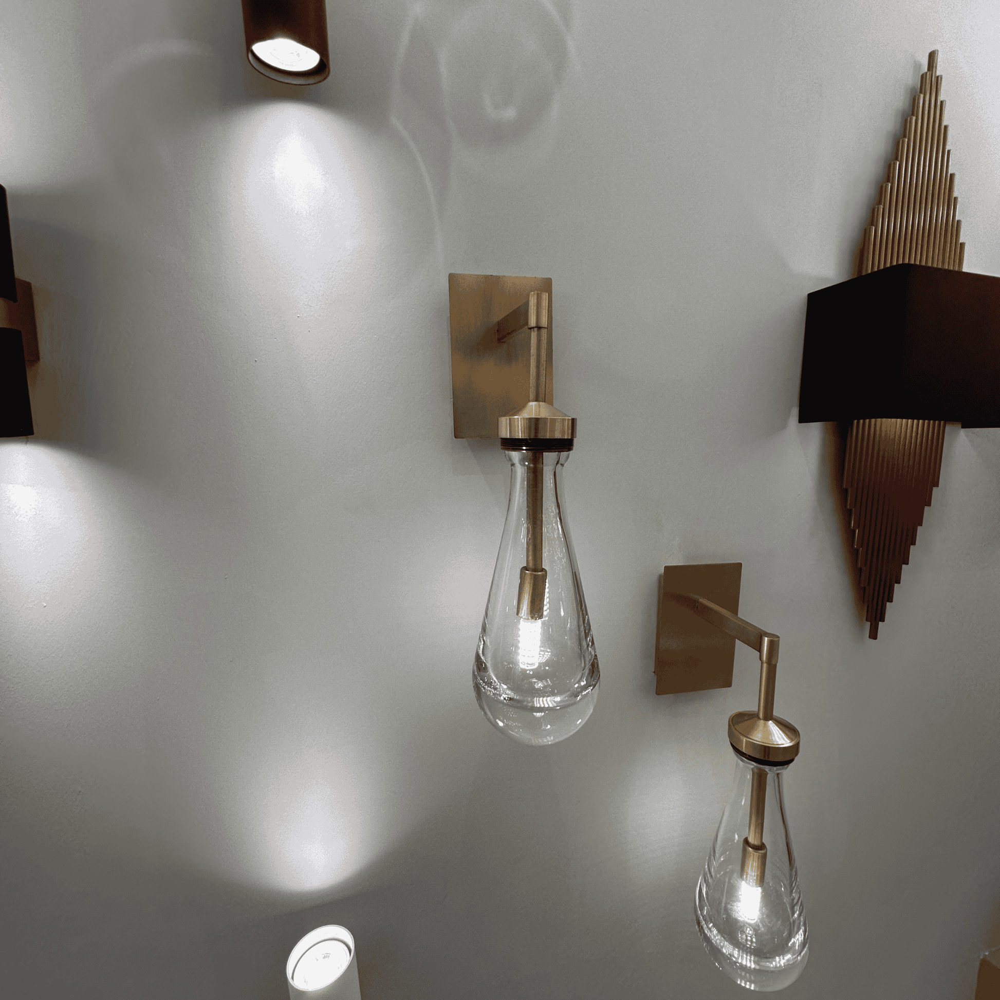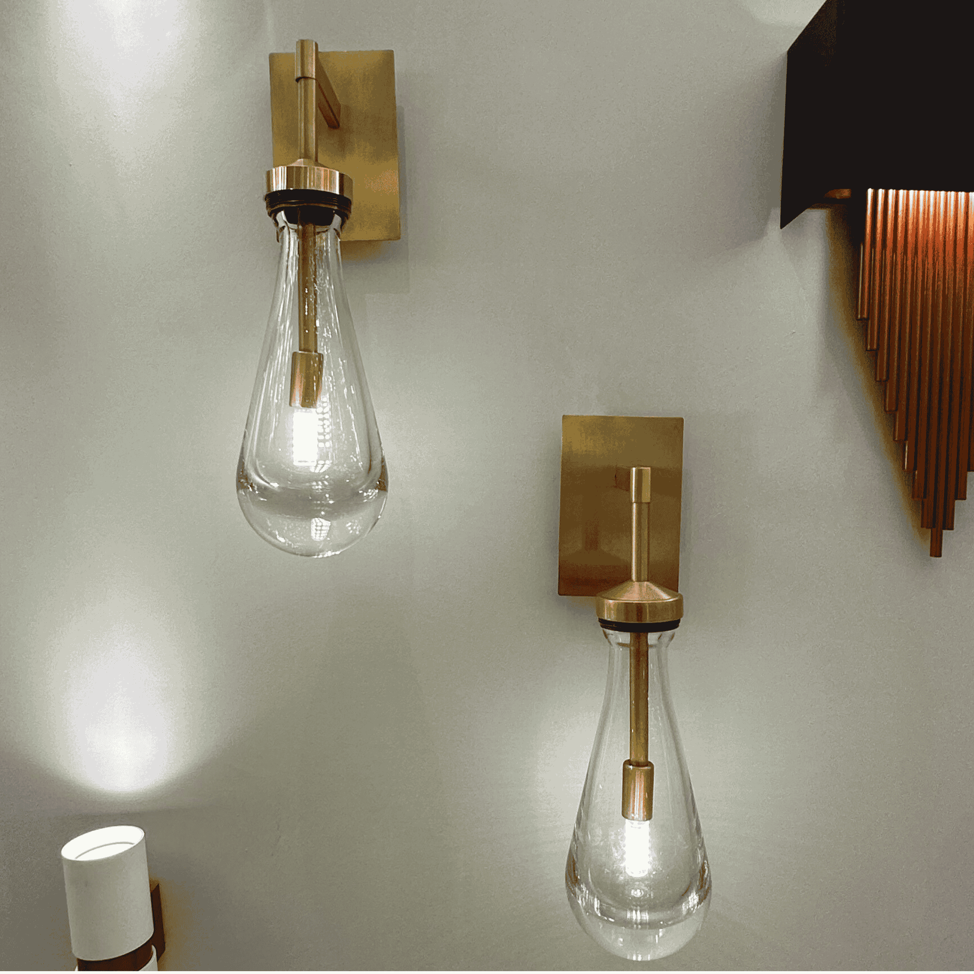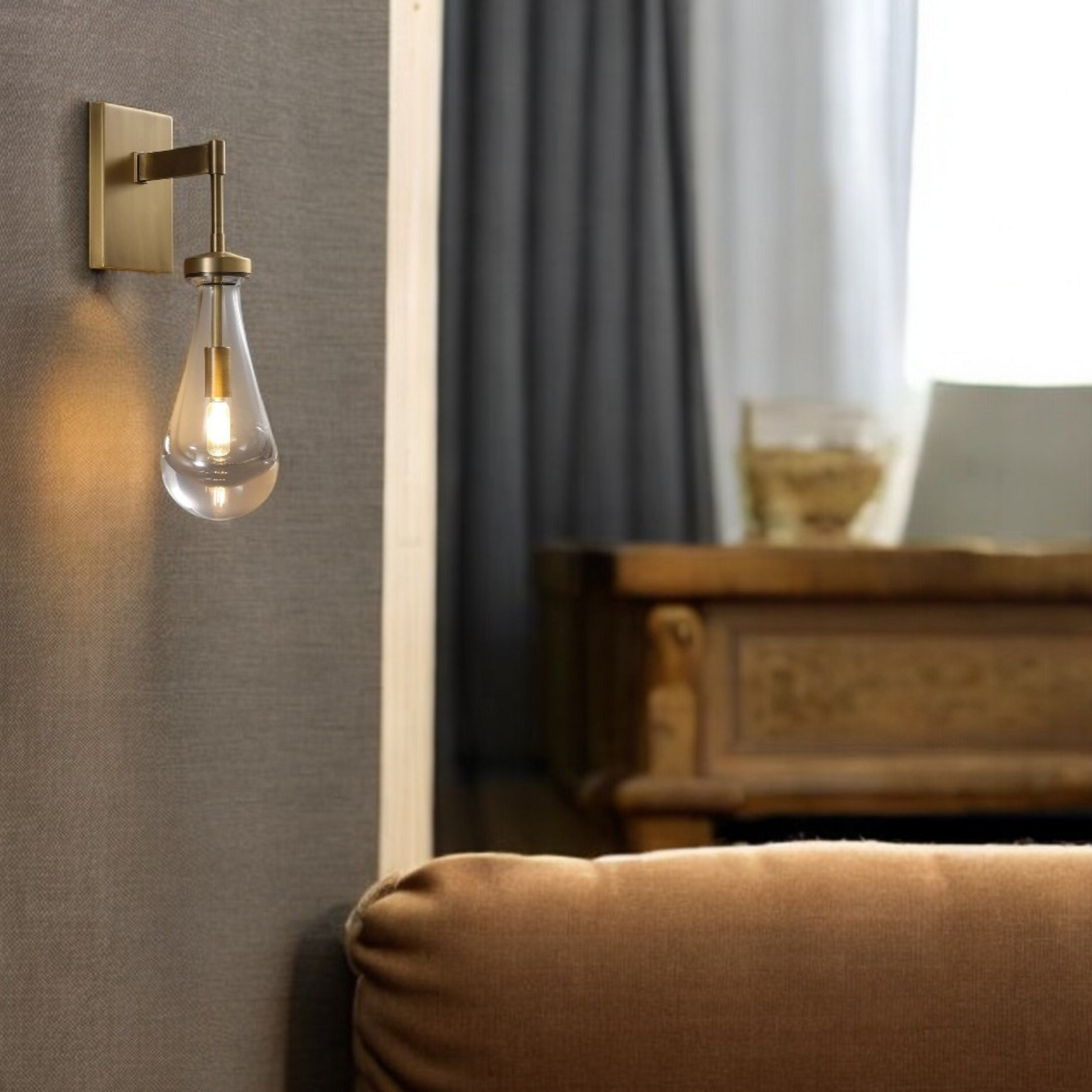 āØA sleek wall sconce with a raindrop-shaped glass shade and brushed brass mount ā a perfect blend of elegance and modern minimalism.